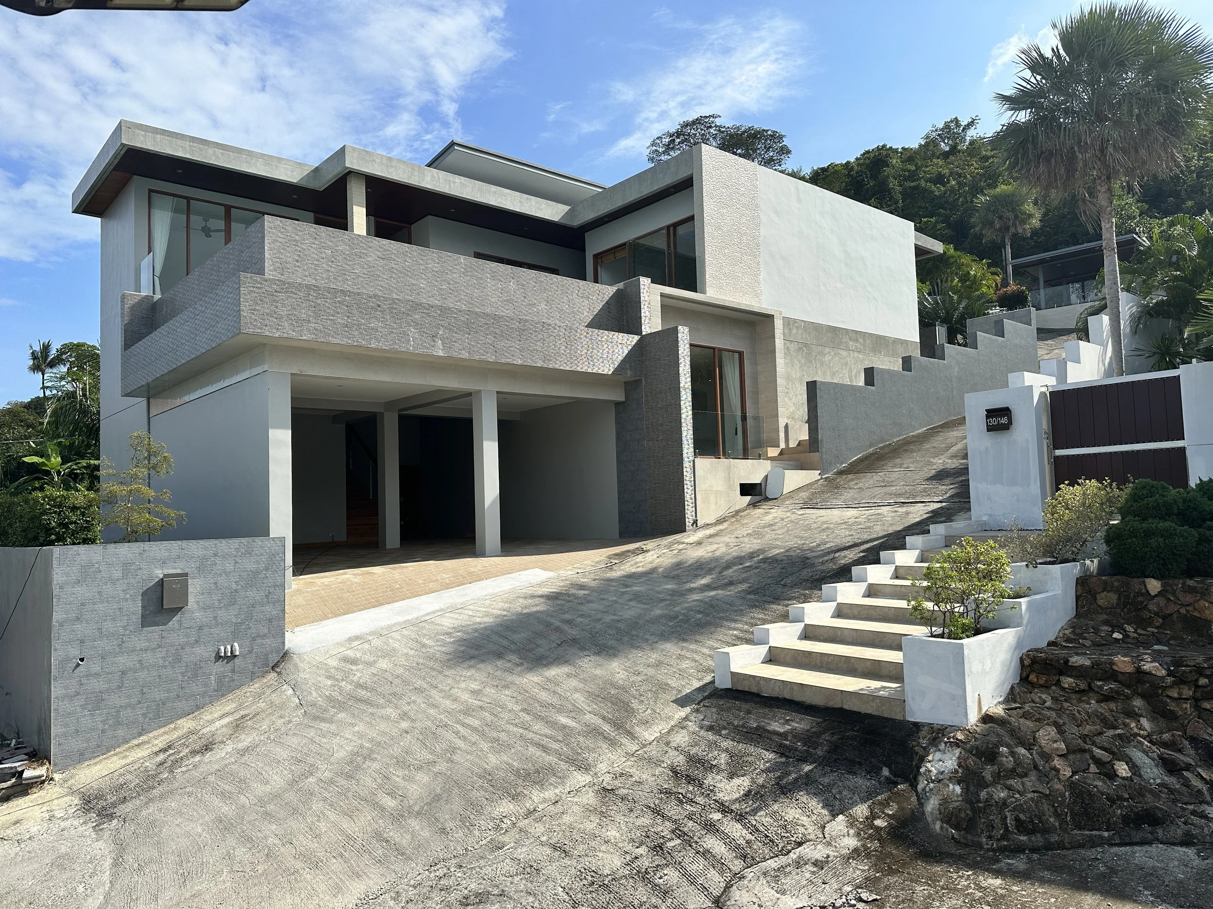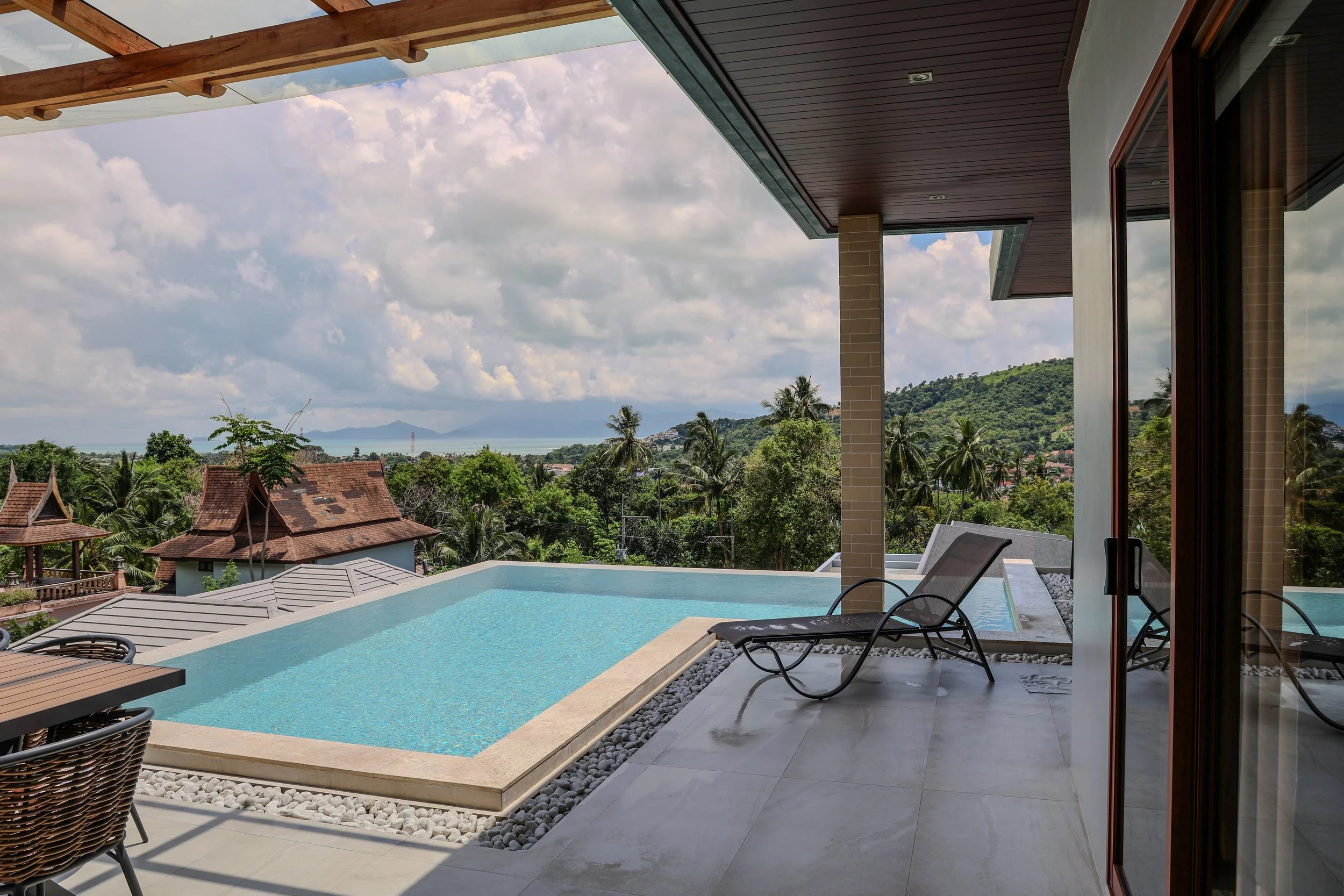 On the main floor, two master ensuites with king-size beds and exquisite decor offer luxurious comfort. The generously sized kitchen and living area provide breathtaking views of the sea and Ko Pha Ngan. Additionally, there is a shower room for the pool and and an office space or room.