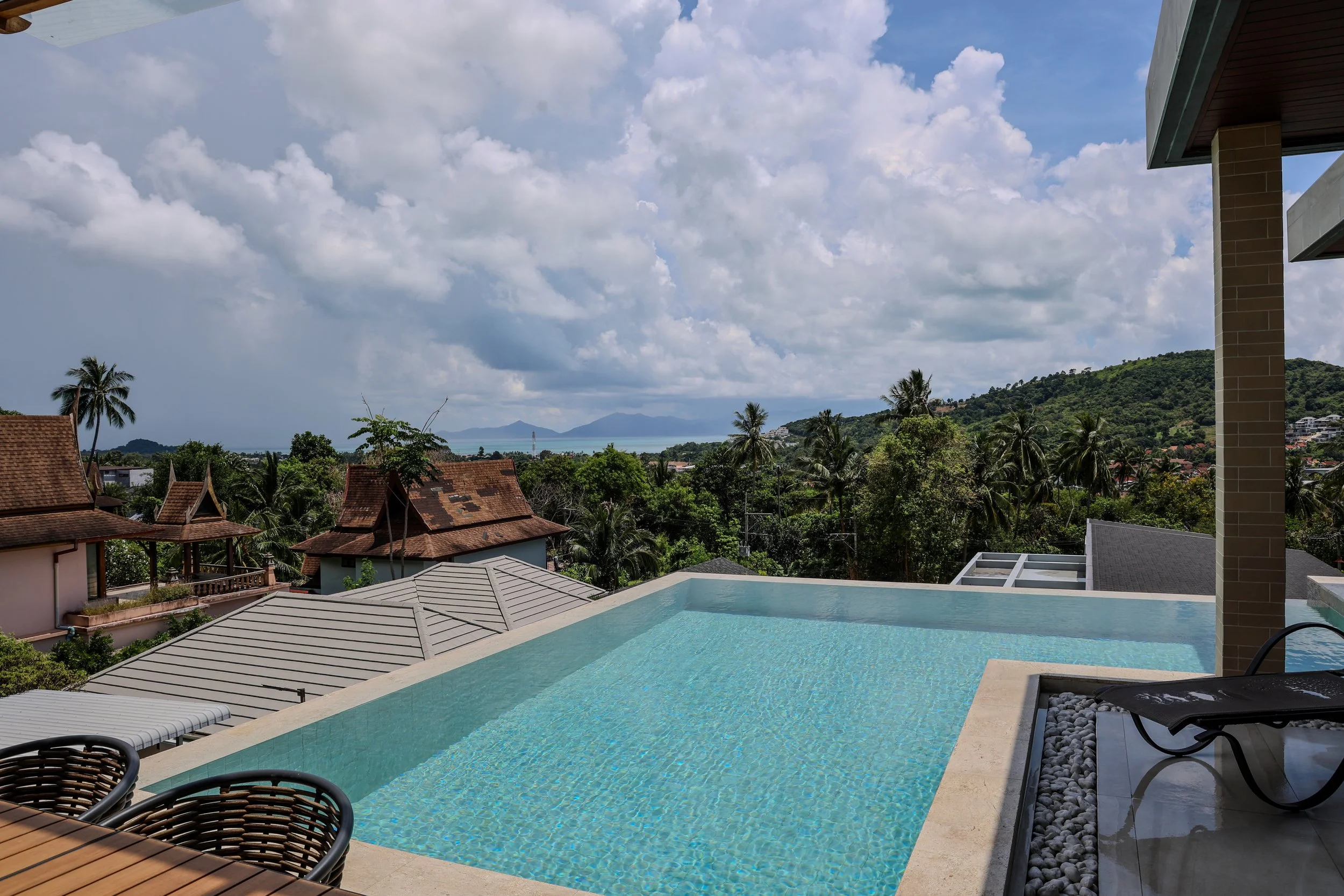 The patio offers ample space and breathtaking views, while the expansive infinity pool, reaching a depth of 1.5 meters, features gentle stairs for easy access. There's plenty of space to relax and unwind by the pool, whether it's during the day or in the evening.